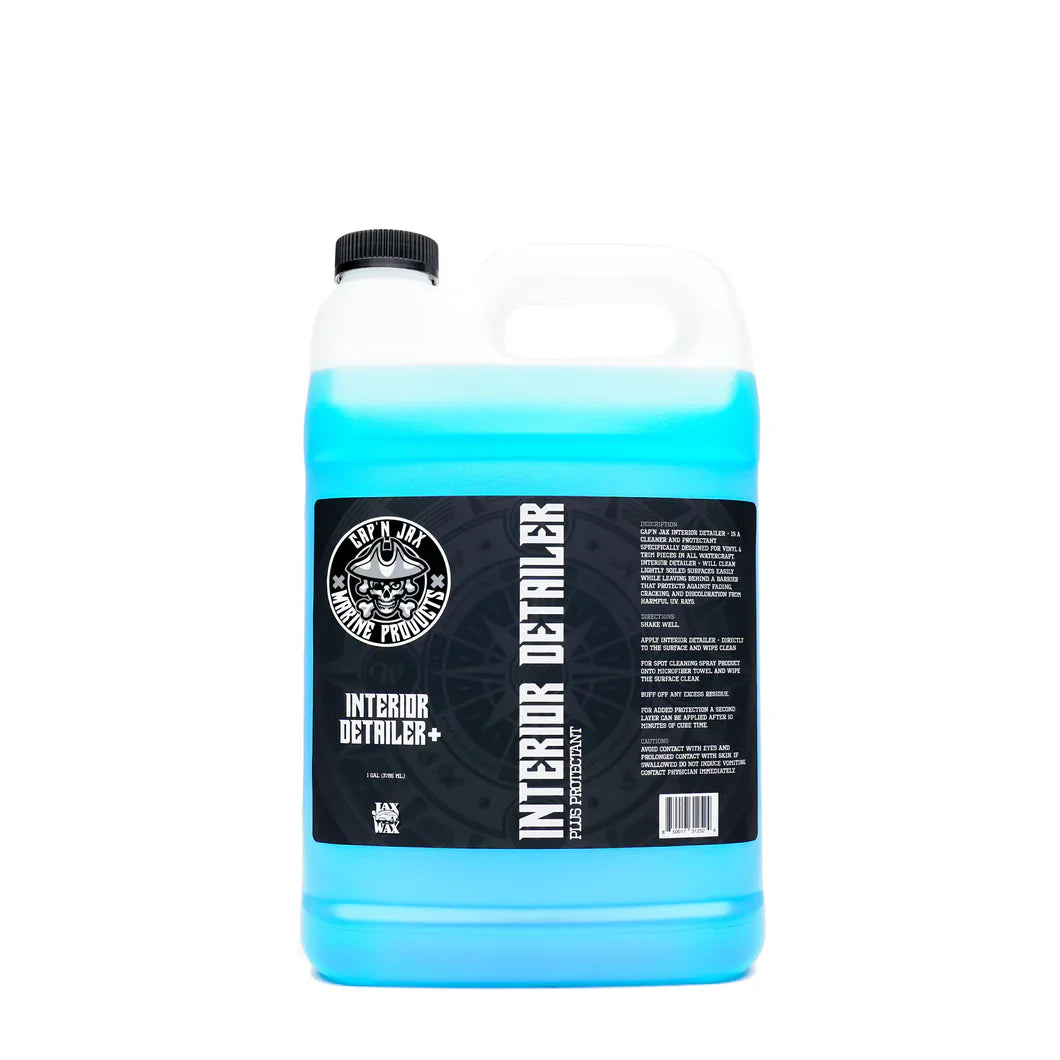 Cap’n Jax Interior Detailer + is a cleaner and protectant specifically designed for vinyl & trim pieces in all watercraft. Interior Detailer + will clean lightly soiled surfaces easily while leaving behind a barrier that protects against fading, cracking, and discoloration from harmful U.V. rays.